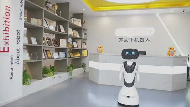 Humanoid appearance in black and white, with articulated arms and head for a closer and friendlier presence